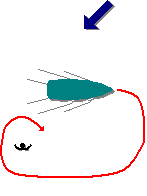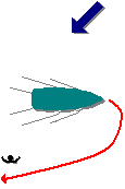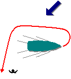 | 24. | Ao conduzir em mar aberto a embarcação da figura, um tripulante cai à água no local indicado. Sabendo que o vento sopra como assinalado e que não há corrente significativa, escolha a figura com a manobra de rotação mais correcta. | ||||||